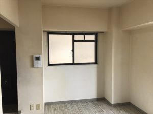 居住年数11年経過して居る事また、おタバコを吸われていた為クロスの変色やクッションフロアの凹みは目立つ状況でした。今回の原状回復のポイントはクッションフロアからフロアタイルへの貼替洗濯機置場の増設です。